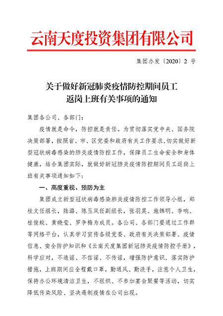 疫情就是命令,防控就是责任。为贯彻落实党中央、国务院决策部署,按照省、市、区党委和政府有关工作要求,切实做好新型冠状病毒感染的肺炎疫情防控工作,保障员工生命安全和身体健康,集团成立新型冠状病毒感染肺炎疫情防控工作领导小组,并就做好新冠肺炎疫情防控期间员工返岗上班有关事项作出通知: