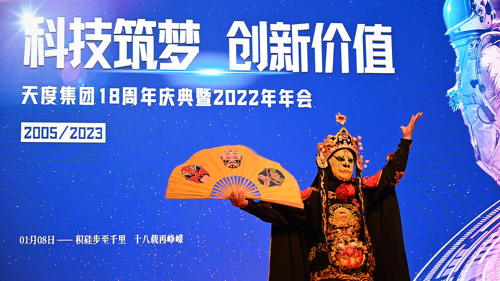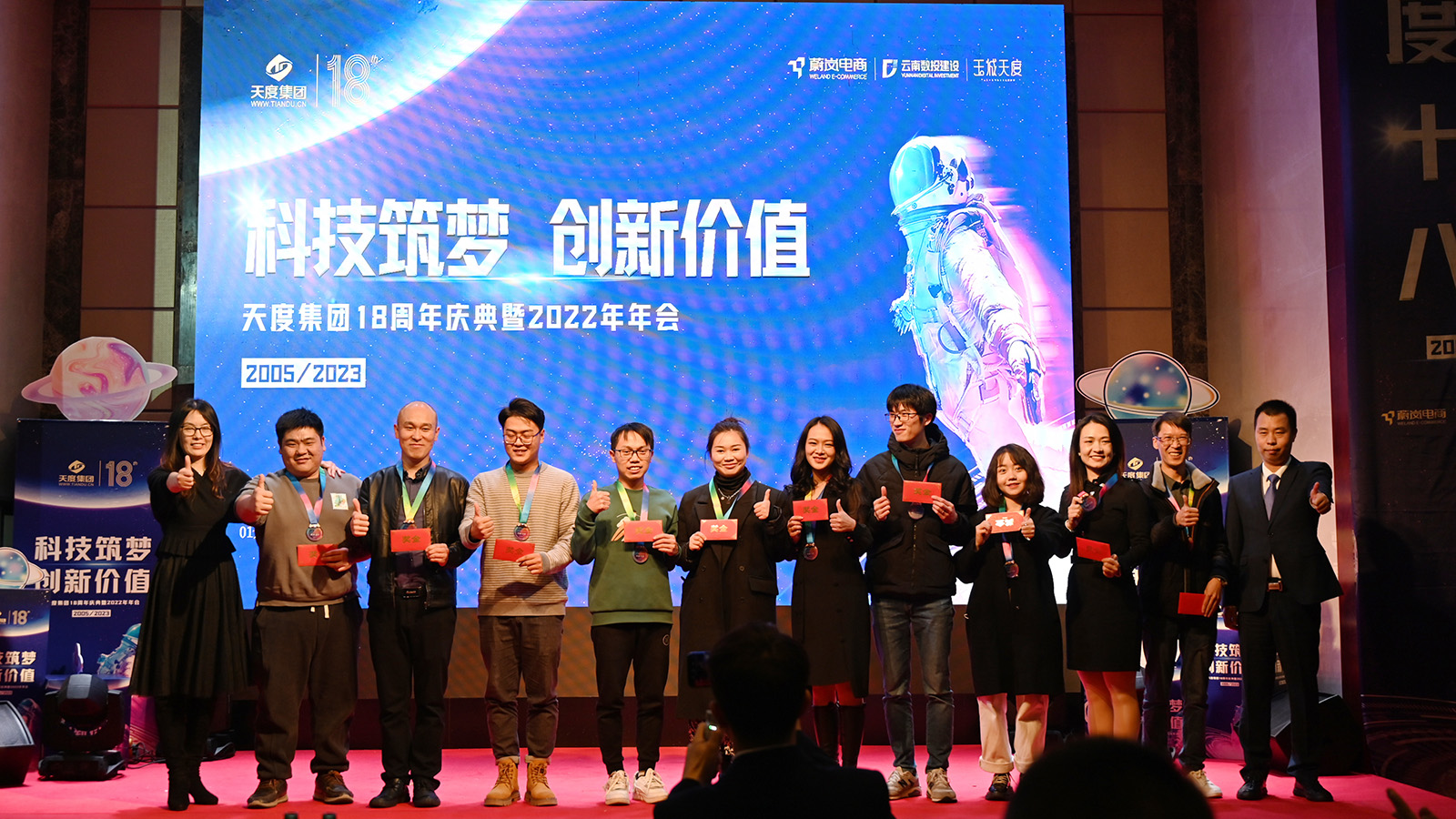 浩瀚宇宙、璀璨星际,以元宇宙为主题的舞台布景绚丽多彩;默剧、变脸、乐器、小人舞,主题多样的节目表演精美绝伦;回首过往、立足当下、展望未来的董事长演讲振奋人心;奖爱岗敬业、优秀员工的颁奖典礼树立集团模范;还有一轮轮的抽奖环节,将年会盛典推向一波又一波高潮。